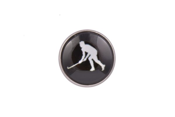 Our Field Hockey lapel pin badge is the perfect jacket accessory for players and fans alike. Â Featuring a black and white image of a hockey player with hockey stick in motion our sports themed lapel pin will be a fantastic gift purchase for someone special.