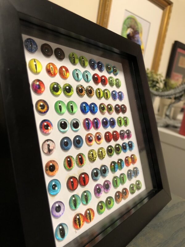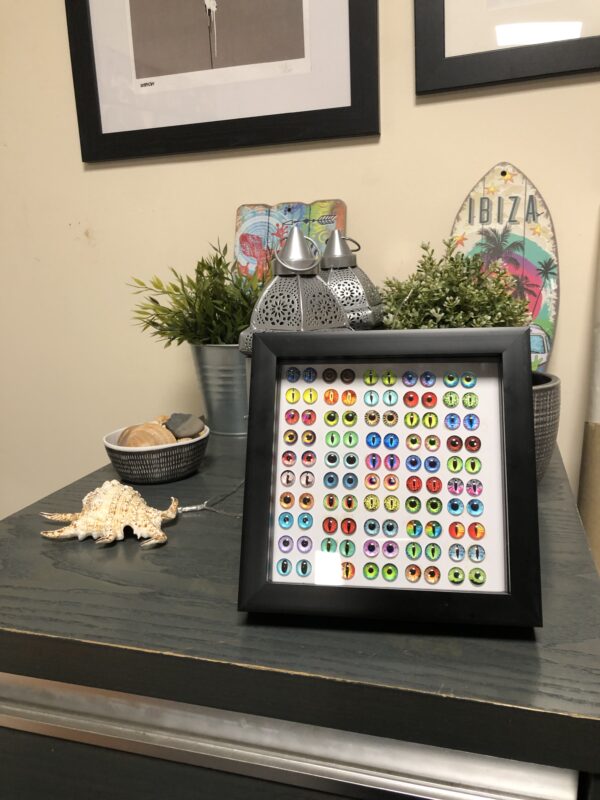 Each framed piece is uniquely made on order but dispatched within 48 hours. Â Each art piece will include 50 pairs of eyes as shown but they maybe in different positions to the one shown on this link.